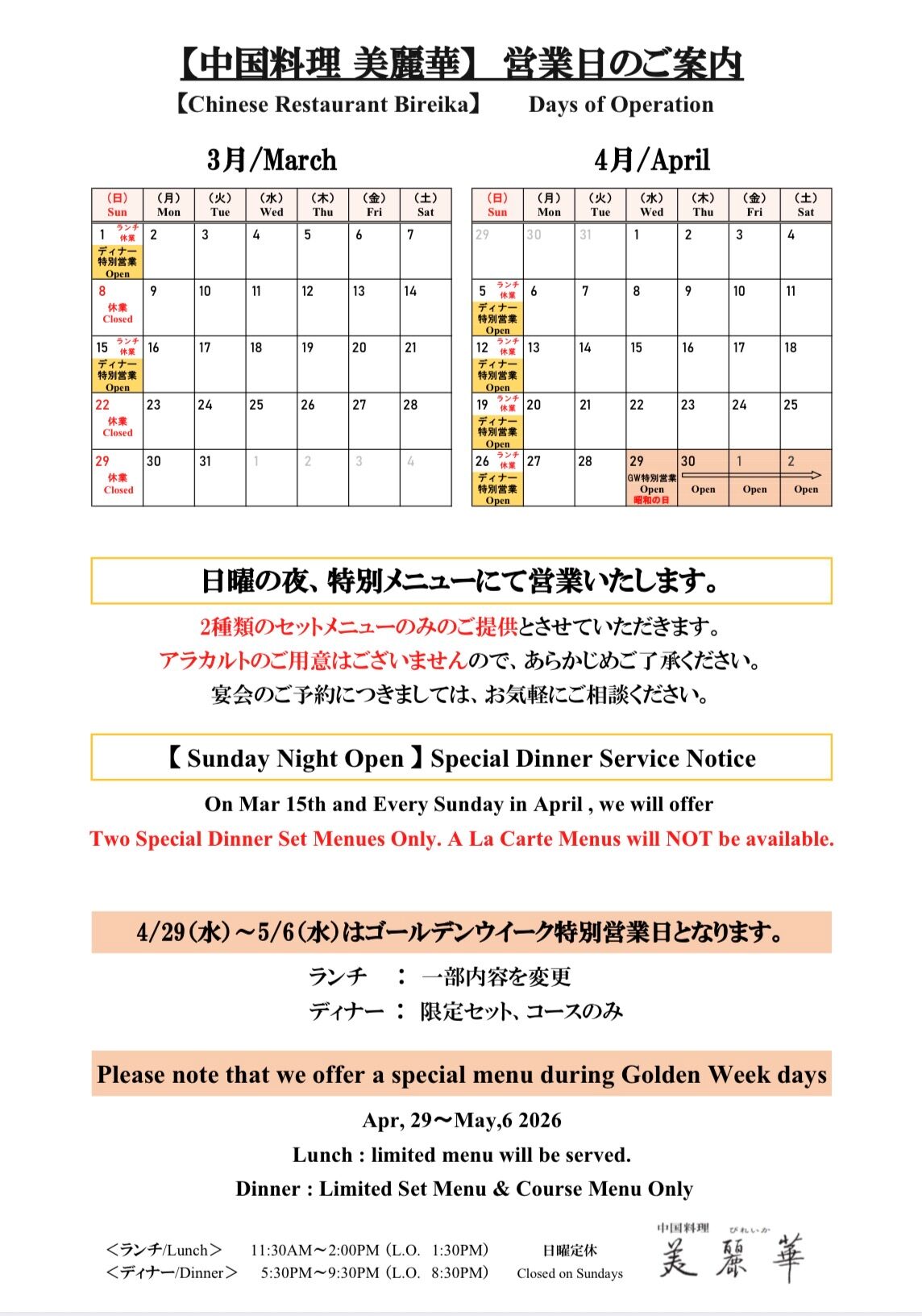 中国料理 美麗華 ランチメニュー リニューアルのお知らせ