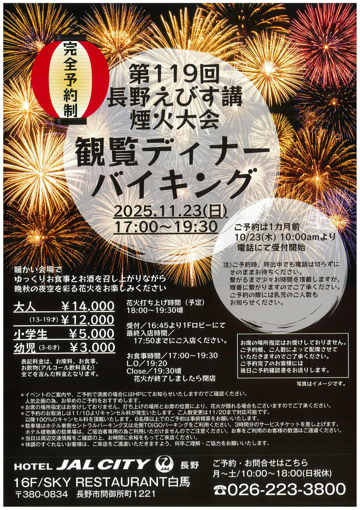 【10月23日10:00AMよりご予約受付開始】11/23(日)えびす講煙火大会ディナーバイキング