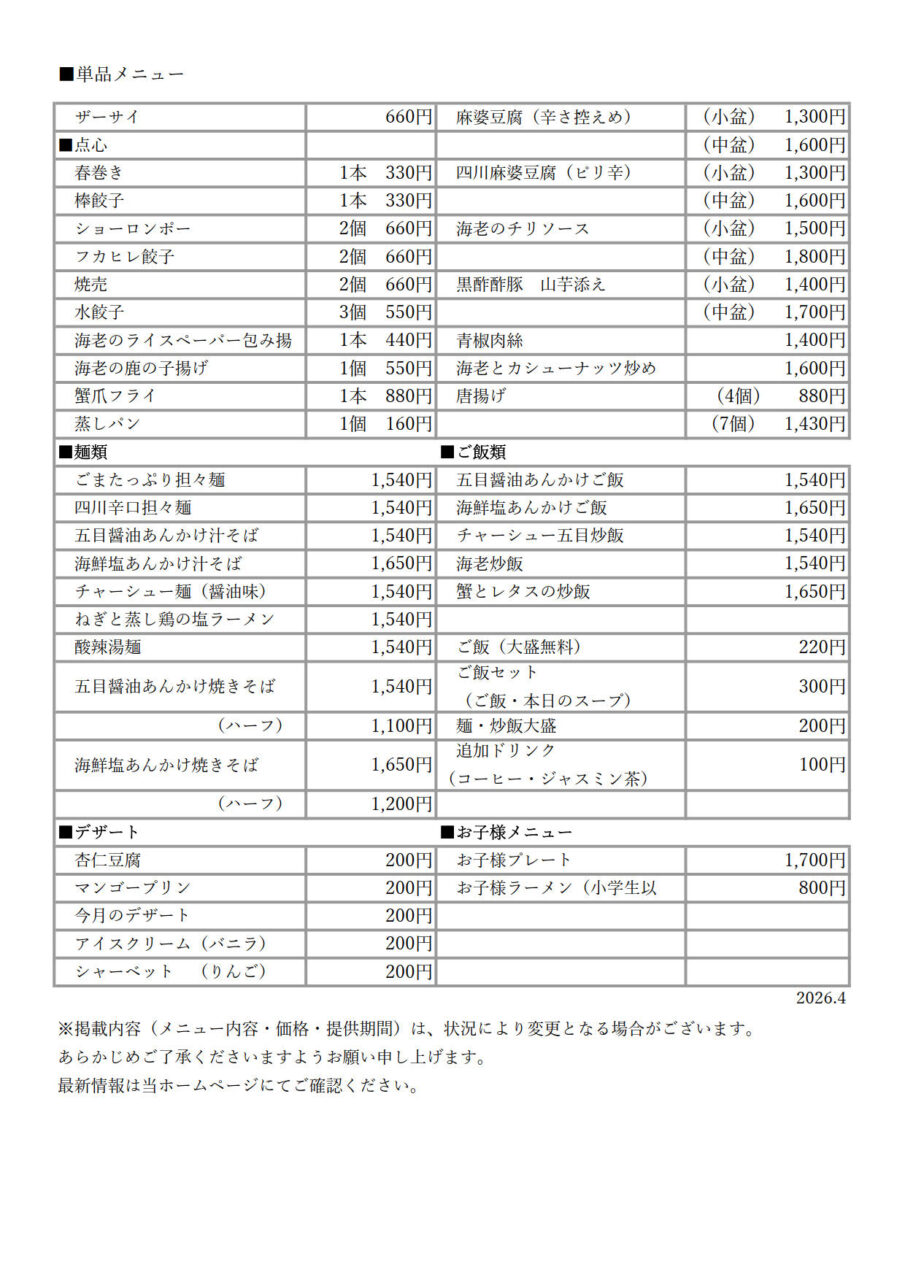 | 4/27~4/30 | 蟹肉入り海鮮あんかけ焼きそば |